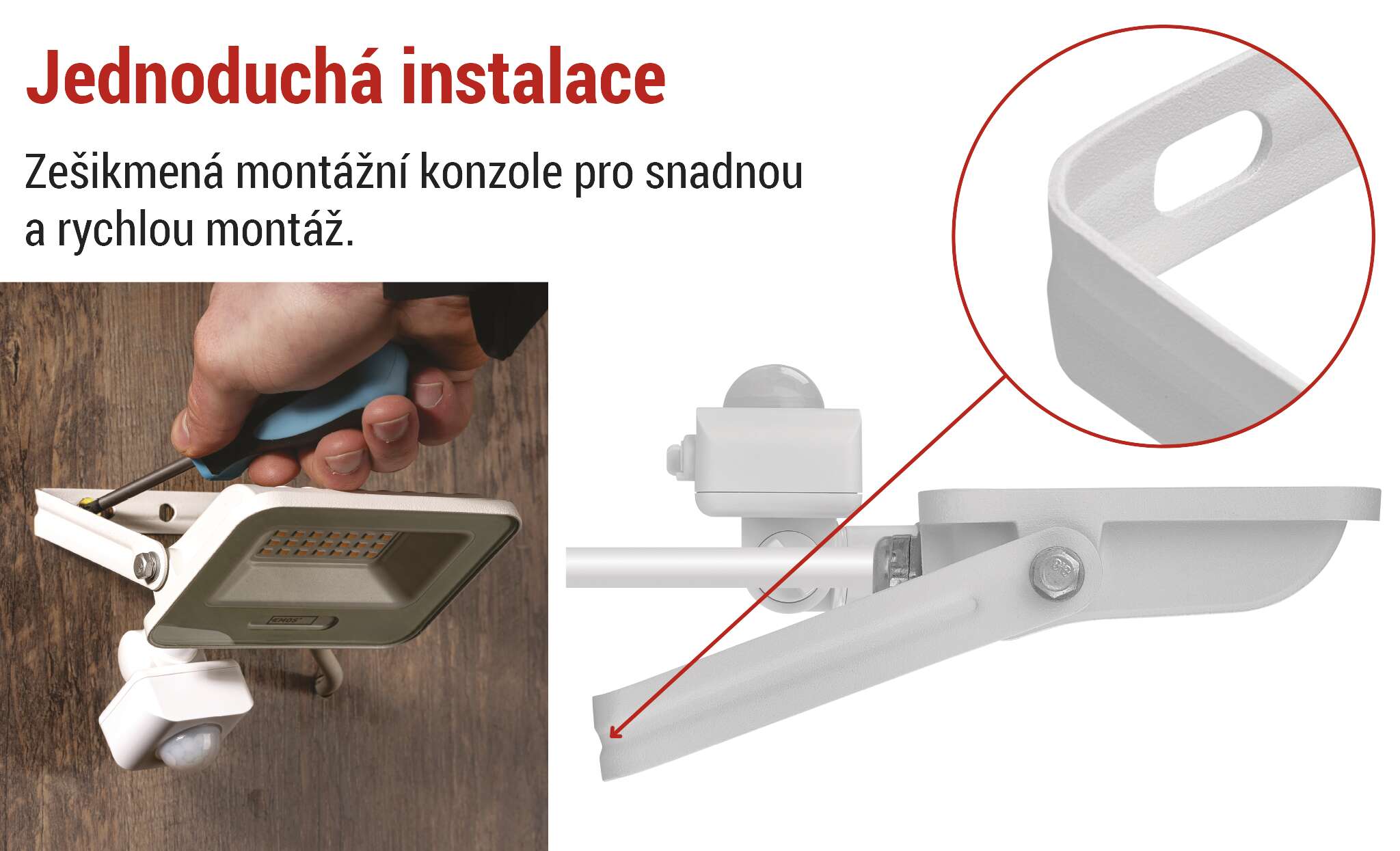 Reflektory GLARO s PIR senzorem jsou navrženy s praktickou zešikmenou montážní konzolí, která umožňuje rychlou a pohodlnou instalaci na stěnu, fasádu či jiný podklad. Díky možnosti nastavení úhlu osvětlení přesně podle potřeby můžete světlo směrovat tam, kde je nejvíce potřeba, aniž by bylo nutné složité vrtání či úpravy. Jednoduchá montáž šetří čas i námahu a dělá z GLARO ideální volbu pro domácí instalace.