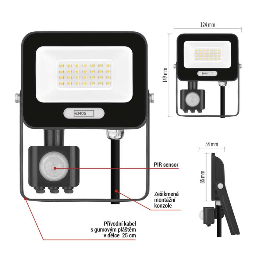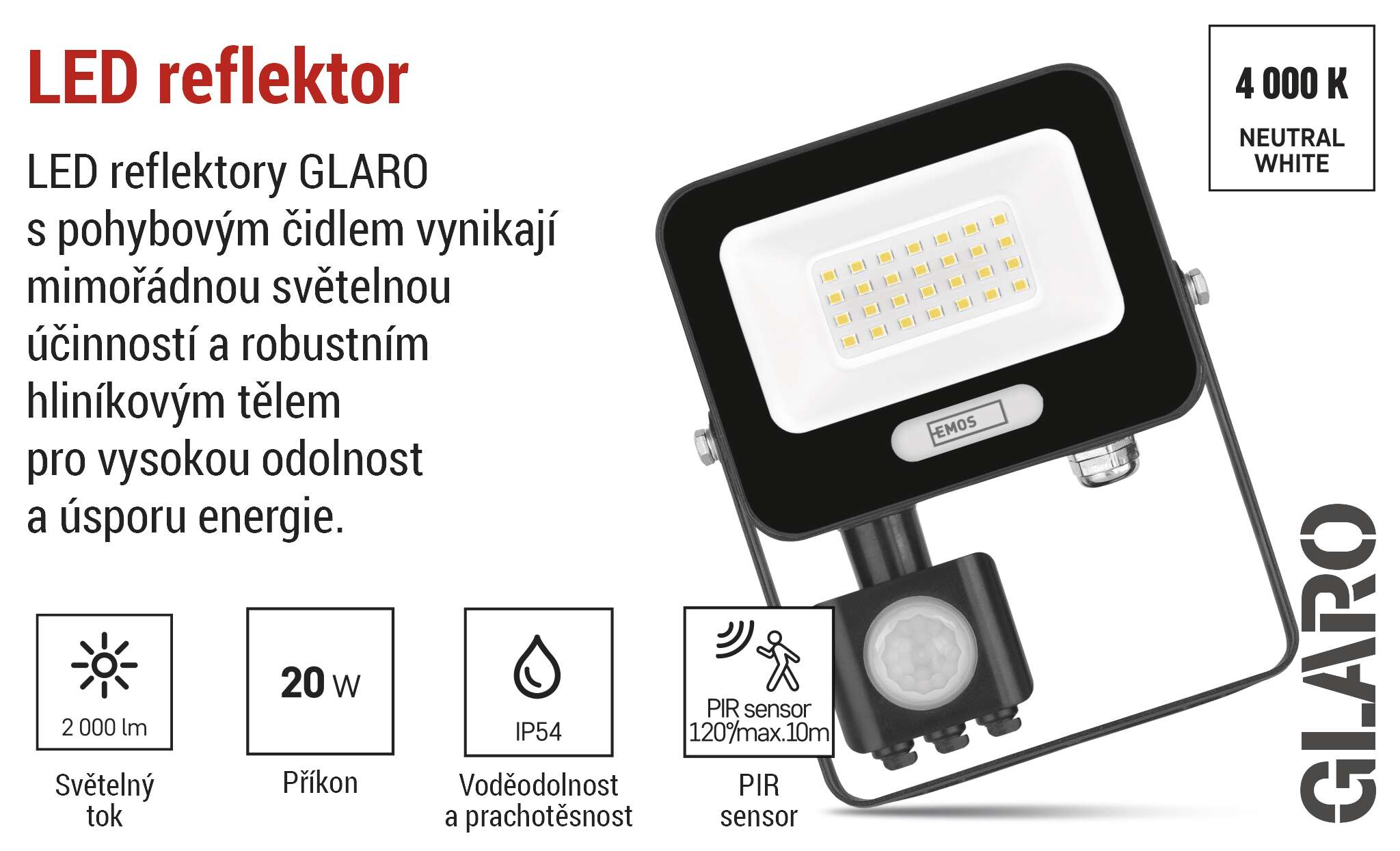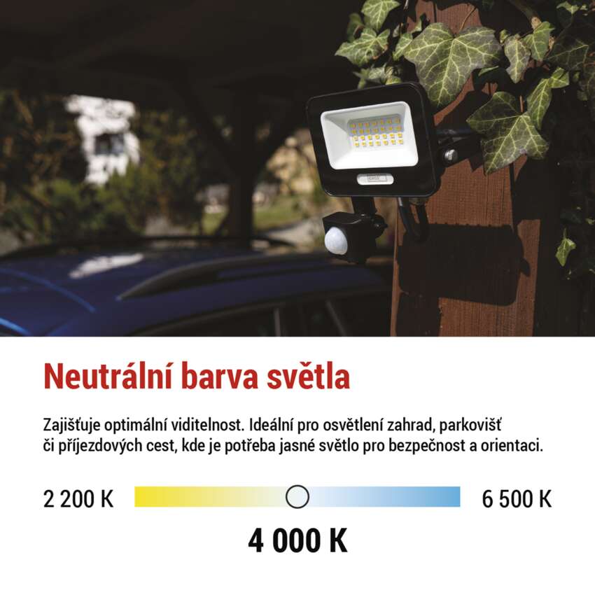 LED reflektory GLARO s PIR senzorem přinášejí pohodlné a energeticky úsporné venkovní osvětlení. Díky automatickému spínání při detekci pohybu svítí jen tehdy, kdy je to skutečně potřeba – ideální pro zvýšení bezpečnosti a komfortu na vašem pozemku. Reflektory jsou vhodné pro montáž pod střechu nebo na stěnu objektu, chráněné krytím IP54. Představují praktické řešení pro osvětlení vstupů, garáží, zahradních chodníků, příjezdových cest i firemních prostor. Jednoduché nastavení citlivosti senzoru a délky svícení umožňuje přizpůsobení podle vašich potřeb.