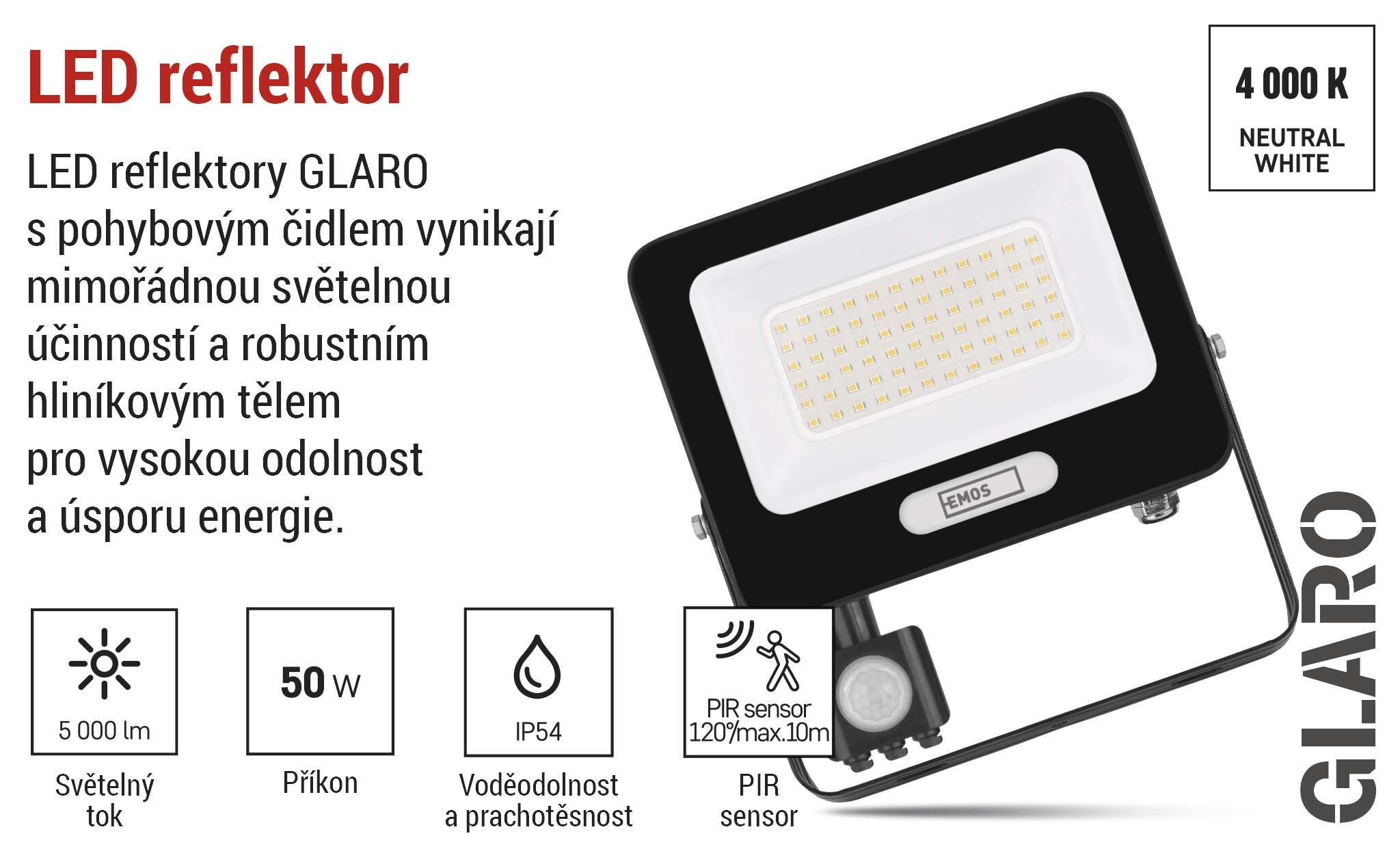 LED reflektory GLARO s PIR senzorem přinášejí pohodlné a energeticky úsporné venkovní osvětlení. Díky automatickému spínání při detekci pohybu svítí jen tehdy, kdy je to skutečně potřeba – ideální pro zvýšení bezpečnosti a komfortu na vašem pozemku. Reflektory jsou vhodné pro montáž pod střechu nebo na stěnu objektu, chráněné krytím IP54. Představují praktické řešení pro osvětlení vstupů, garáží, zahradních chodníků, příjezdových cest i firemních prostor. Jednoduché nastavení citlivosti senzoru a délky svícení umožňuje přizpůsobení podle vašich potřeb.