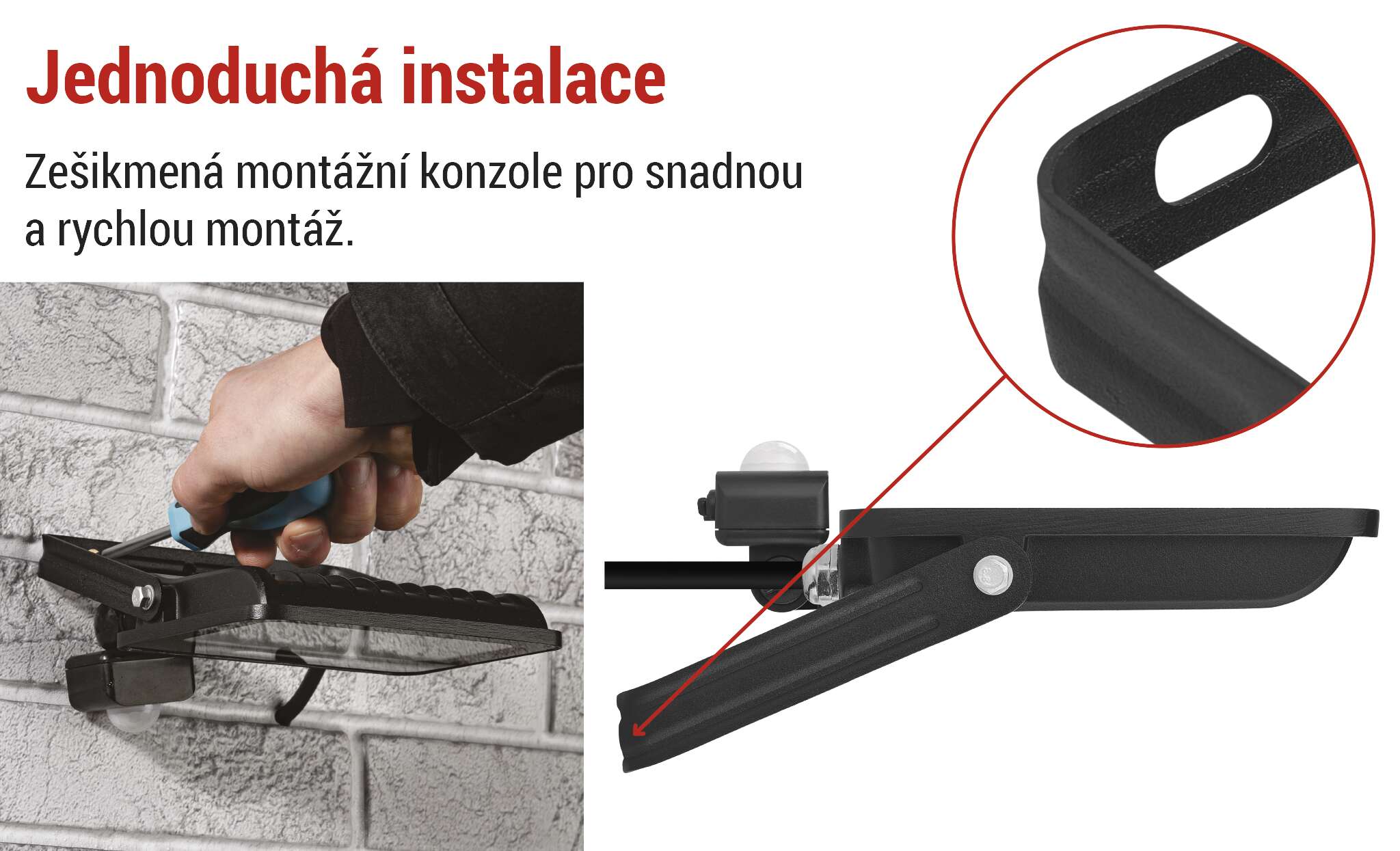 Reflektory GLARO s PIR senzorem jsou navrženy s praktickou zešikmenou montážní konzolí, která umožňuje rychlou a pohodlnou instalaci na stěnu, fasádu či jiný podklad. Díky možnosti nastavení úhlu osvětlení přesně podle potřeby můžete světlo směrovat tam, kde je nejvíce potřeba, aniž by bylo nutné složité vrtání či úpravy. Jednoduchá montáž šetří čas i námahu a dělá z GLARO ideální volbu pro domácí instalace.
