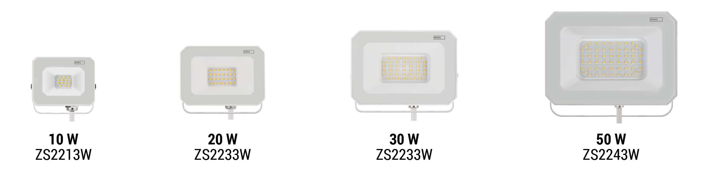 Bílé provedení reflektorů SIMPO přináší bohatý výběr v osvětlení. Můžete si zvolit ze 4 velikostí přímo úměrných výkonu. Kromě toho SIMPO nabízí i modely s pohybovým PIR senzorem a také variantu v černé barvě.