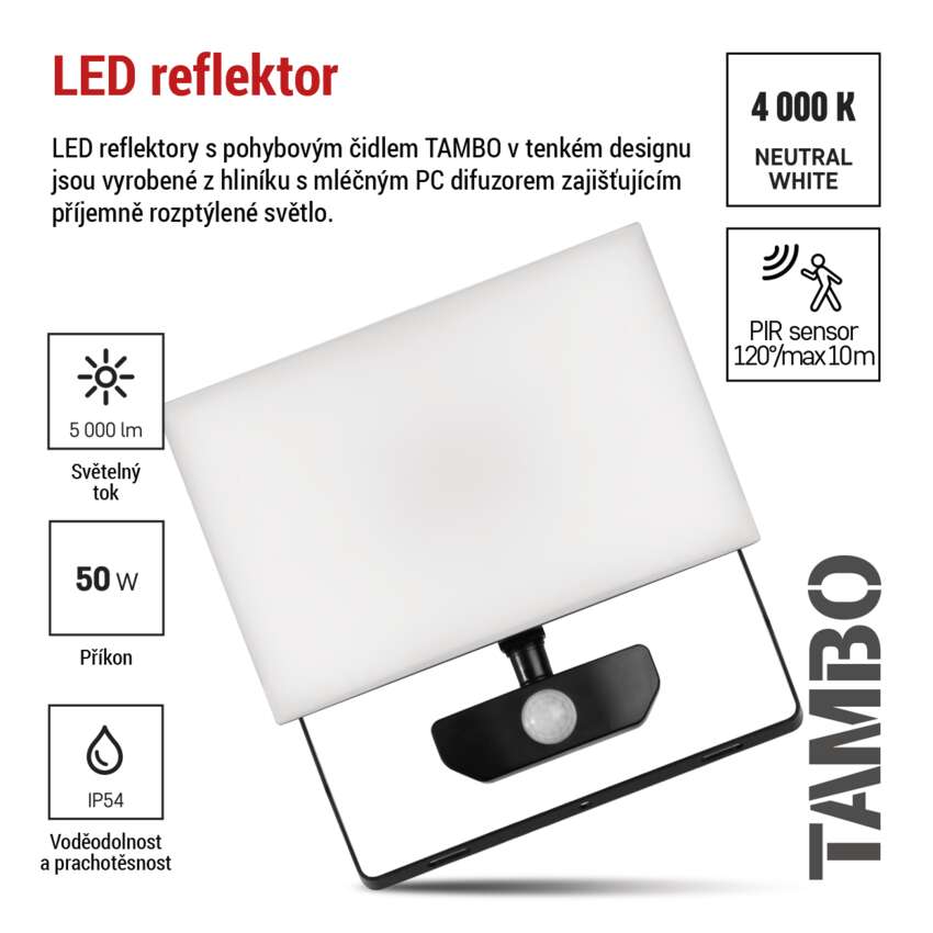 LED reflektor TAMBO se senzorem pohybu, 50 W, 5000 lm, černý
