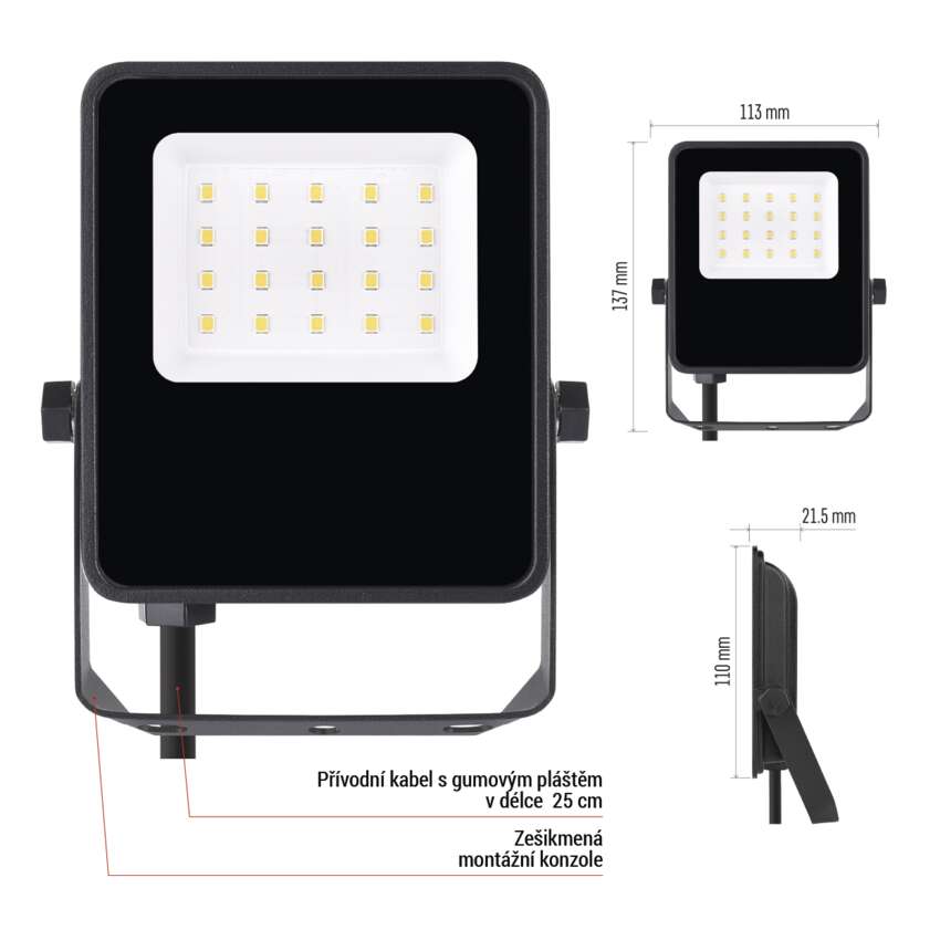 Tento reflektor je jako dělaný pro náročné venkovní prostředí. Krytí IP65 znamená, že bez problémů odolá dešti, prachu i stříkající vodě. Pevné hliníkové tělo chrání vnitřní elektroniku před poškozením a zároveň slouží jako efektivní chladič, který odvádí teplo a prodlužuje životnost. Odolný gumový kabel zůstává pružný i v chladném počasí, takže instalace je snadná a bezpečná i v zimě.