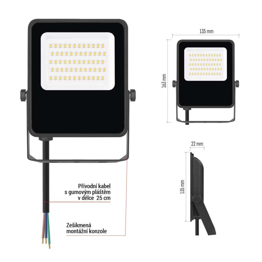 Tento reflektor je jako dělaný pro náročné venkovní prostředí. Krytí IP65 znamená, že bez problémů odolá dešti, prachu i stříkající vodě. Pevné hliníkové tělo chrání vnitřní elektroniku před poškozením a zároveň slouží jako efektivní chladič, který odvádí teplo a prodlužuje životnost. Odolný gumový kabel zůstává pružný i v chladném počasí, takže instalace je snadná a bezpečná i v zimě.