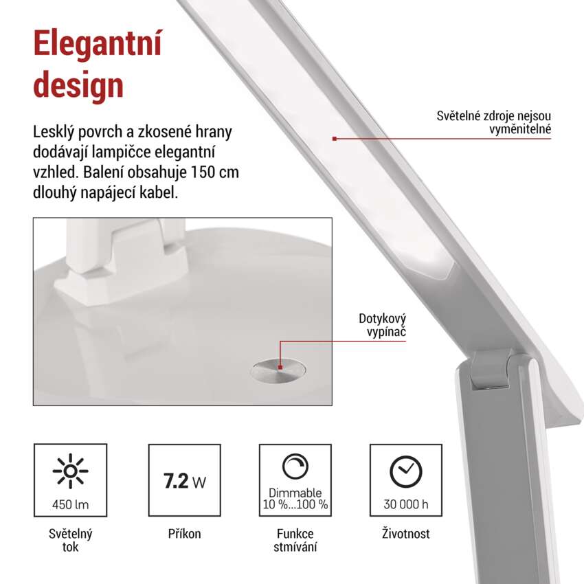 Představujeme vám naši stolní lampičku CHASE. Tato lampička má čistý design a je velmi snadná na použití, což ocení každý uživatel. Díky stabilní konstrukci se nemusíte obávat, že by se vám lampička převrátila. Lampička se pyšní lesklým designem, který dodá vašemu pracovnímu prostoru moderní vzhled. Se světelným tokem až 450 lm poskytne dostatek světla pro jakoukoli vaši činnost.