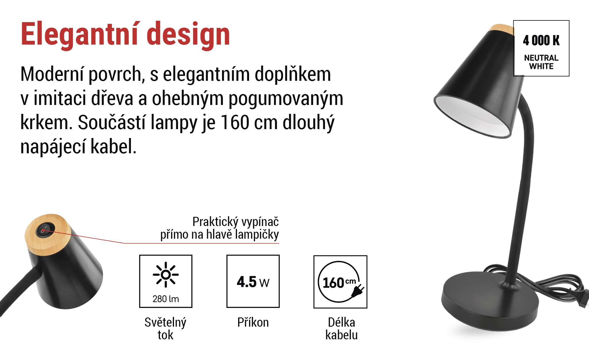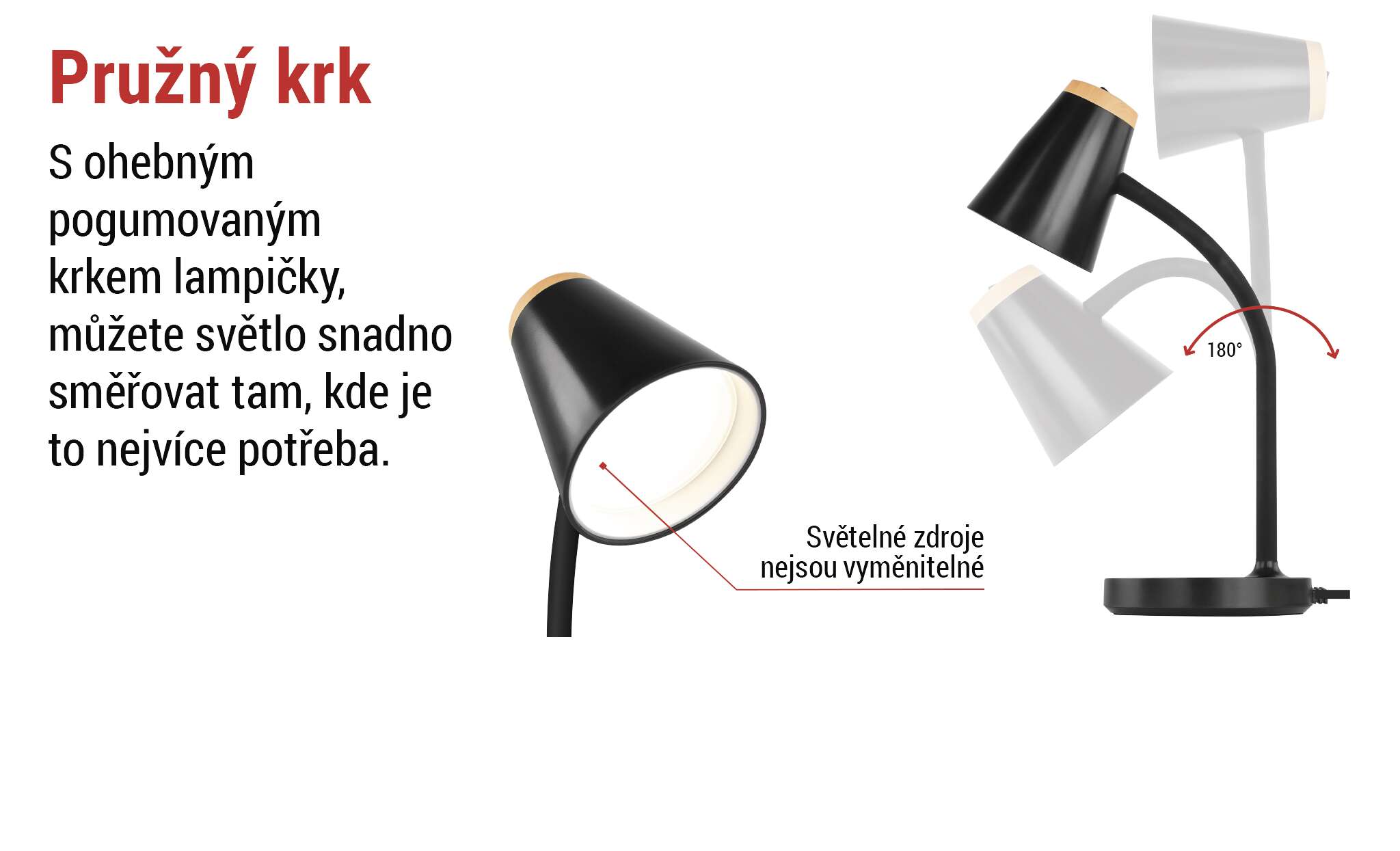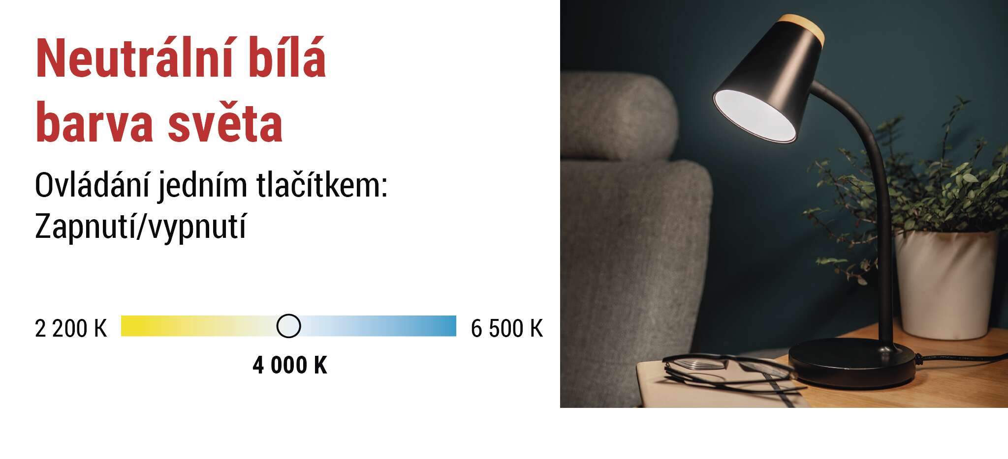 Integrovaný LED světelný zdroj o výkonu 4,5 W poskytuje neutrální bílé světlo (4 000 K), které neunavuje oči a vytváří příjemnou atmosféru pro soustředěnou práci i relaxaci.