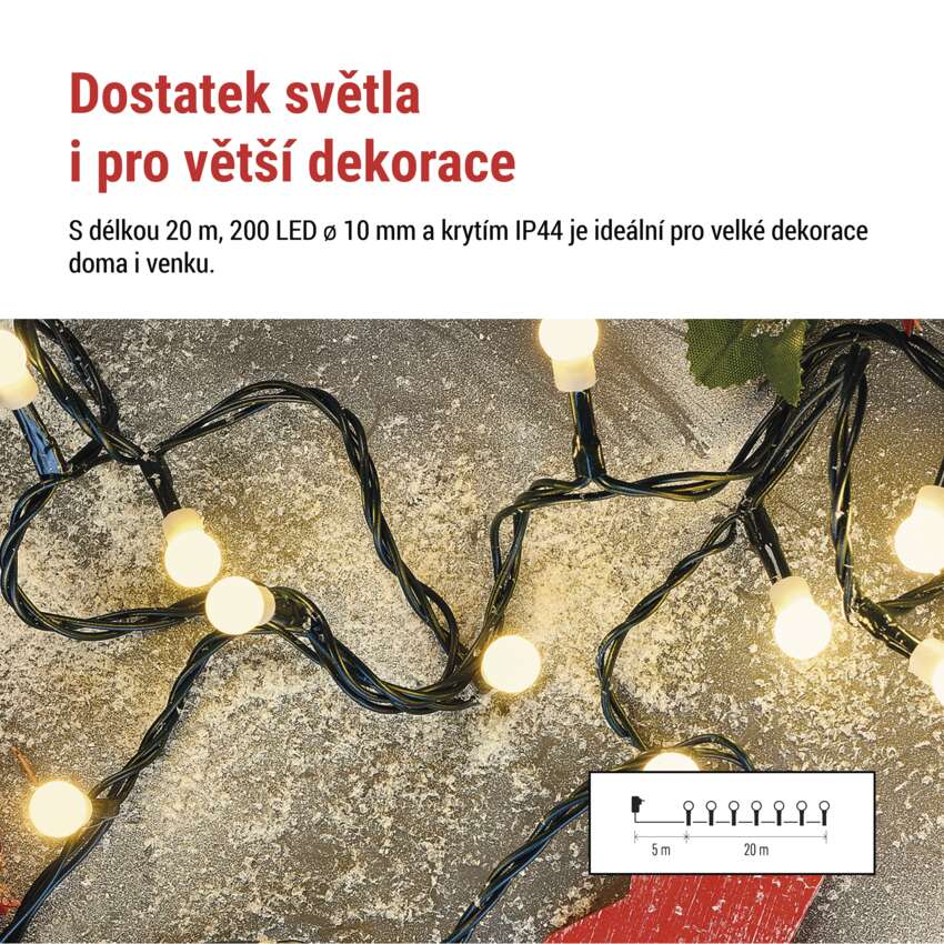 LED vánoční cherry řetěz – kuličky, 20 m, venkovní i vnitřní, teplá bílá, programy,časovač