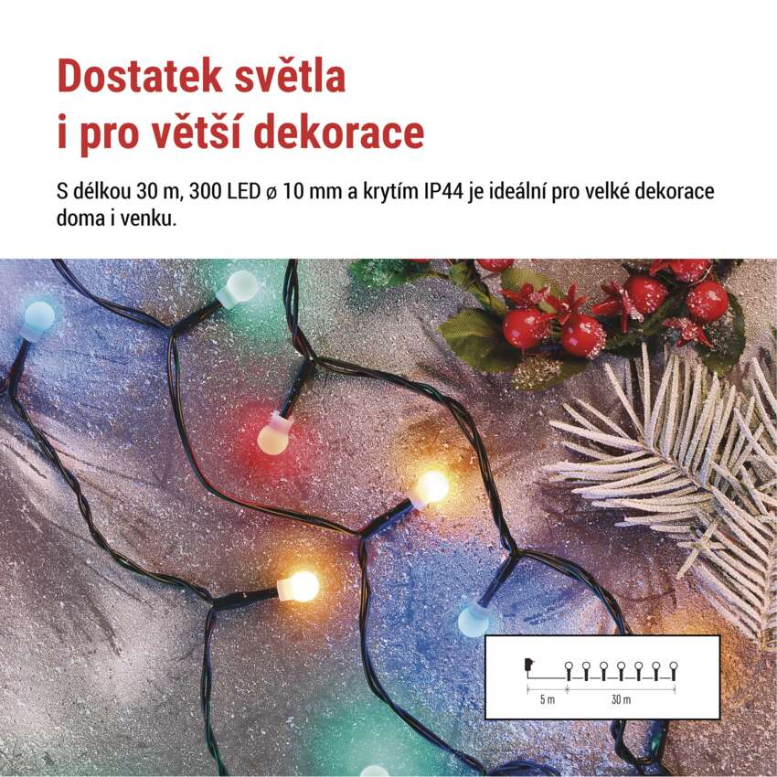 S 30 metry délky a 300 LED diodami snadno ozdobíte nejen menší dekorace v interiéru, ale i větší vánoční stromek nebo zábradlí terasy. Díky krytí IP44 se nemusíte bát použít ho také venku - odolá dešti i sněhu. Skvěle se hodí i pro vytvoření slavnostní atmosféry na rodinné oslavě, svatbě nebo zahradní párty.