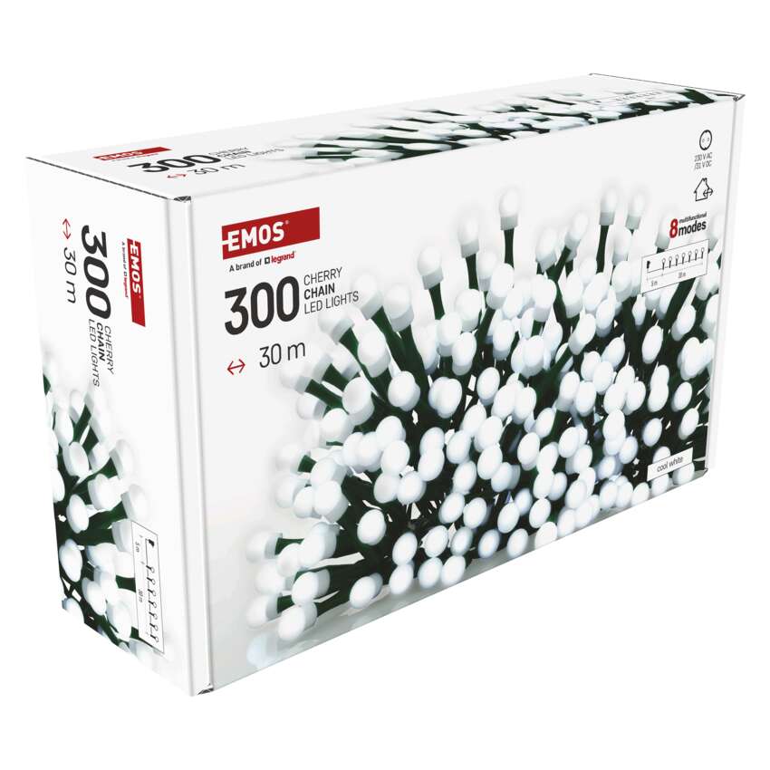 LED vánoční cherry řetěz – kuličky, 30 m, venkovní i vnitřní,studená bílá,programy,časovač