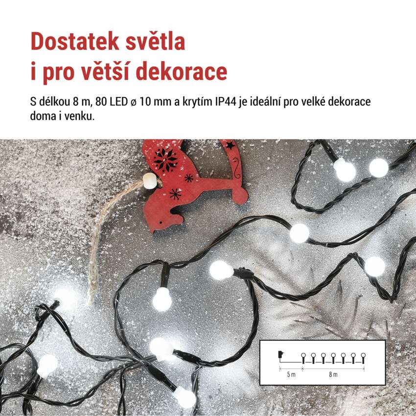 LED vánoční cherry řetěz – kuličky, 8 m, venkovní i vnitřní, studená bílá,programy,časovač