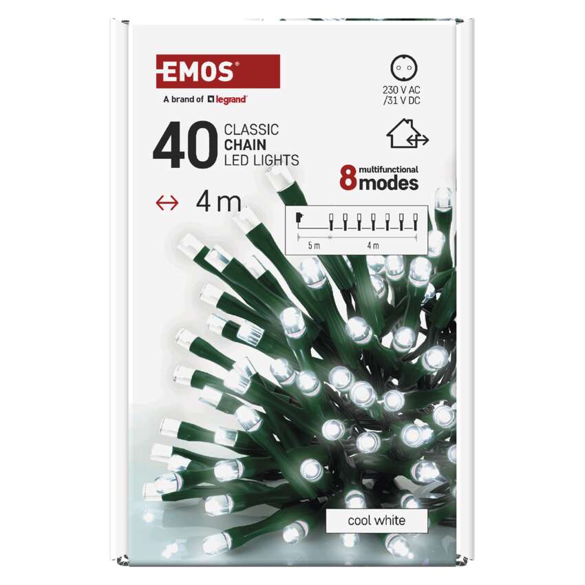 LED vánoční řetěz, 4 m, venkovní i vnitřní, studená bílá, programy, časovač
