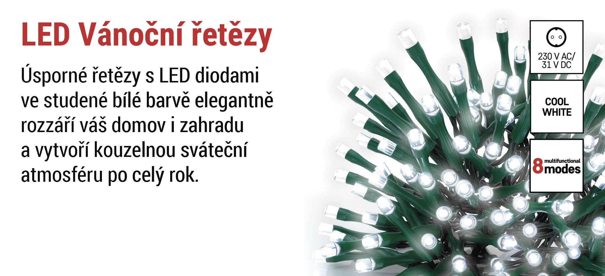 LED vánoční řetěz, 8 m, venkovní i vnitřní, studená bílá, programy, časovač
