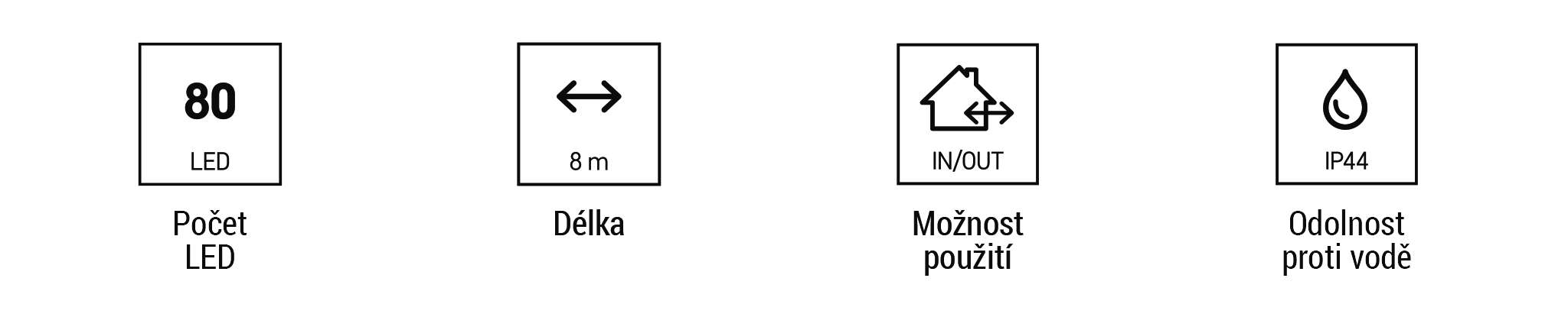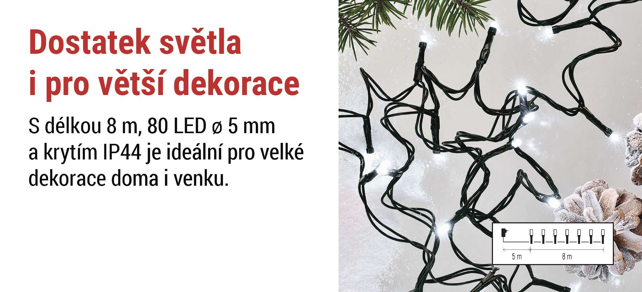 Řetěz obsahuje 80 kvalitních LED diod s příkonem pouhých 3,6 W, čímž se stává vysoce úsporným. Světlo je jasné, rovnoměrné, a přitom šetrné k očím i životnímu prostředí. Životnost LED diod dosahuje až 10 000 hodin svícení, což znamená roky spolehlivého používání bez výměn a starostí.