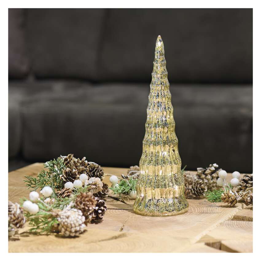 LED vánoční skleněný stromek, 27 cm, 2x CR2032, vnitřní, teplá bílá, časovač