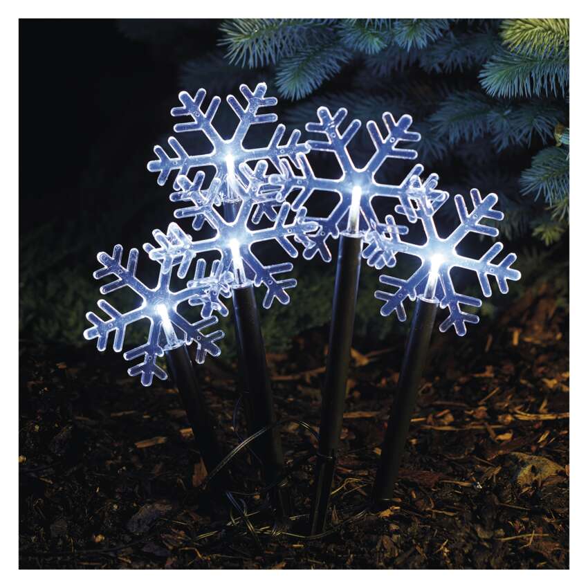 Jak velmi jednoduše vytvořit kouzelnou vánoční atmosféru na zahradě, předzahrádce, záhonu, okrasné skalce nebo u příjezdové cesty k vašemu domu? Odpovědí jsou zapichovací vločky, které svým studeným bílým světlem rozzáří jindy temná zákoutí a přinesou do nich nádech sváteční atmosféry. Kromě tradičního zapíchnutí do země můžete tuto dekoraci naaranžovat i do květináčů či truhlíků, například na balkoně. Při volbě umístění nejste limitováni přítomností elektrické zásuvky, dekorace je napájena pomocí AA baterií.