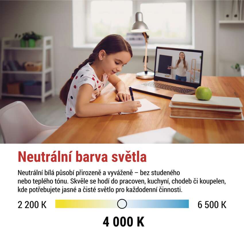 Neutrální bílá vytváří příjemné a přirozené prostředí, které je šetrné k očím a zajišťuje dobrý vizuální komfort po celý den. Díky vyváženému světlu působí barvy interiéru i dekorací přirozeně a věrně, takže každý prostor působí svěže a harmonicky.