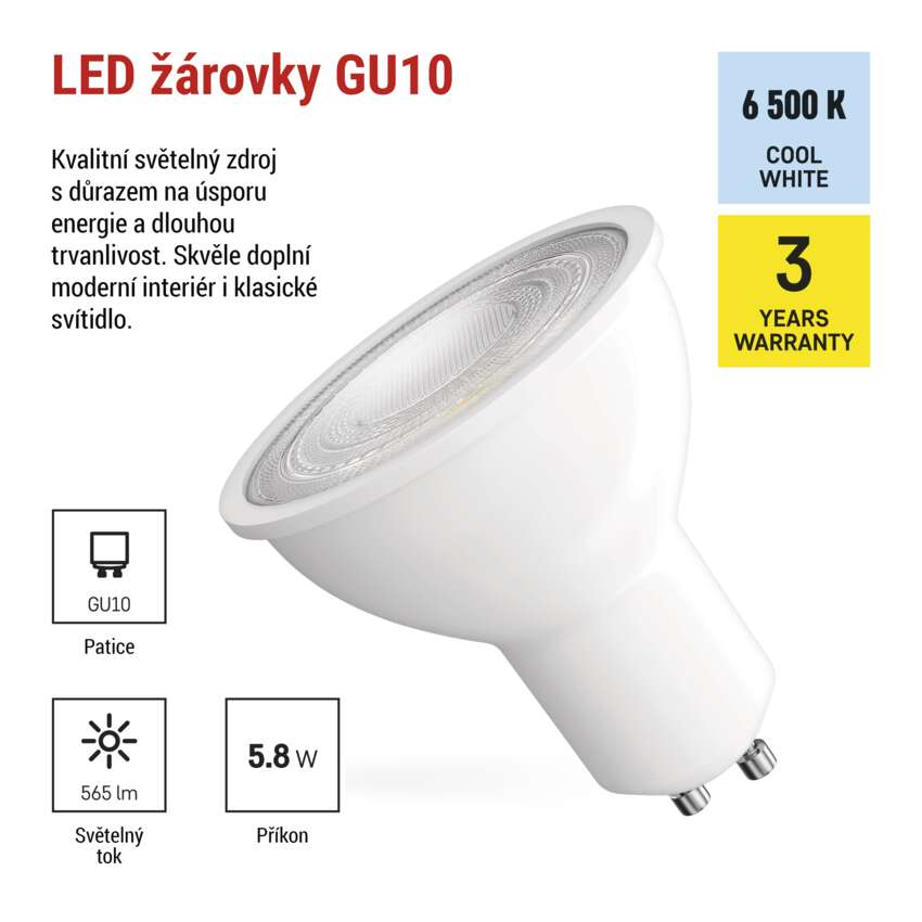 LED žárovka s paticí GU10 je moderní a energeticky úsporná alternativa ke klasickým halogenovým žárovkám. Díky vysoké světelné účinnosti poskytuje jasné a rovnoměrné světlo při minimální spotřebě energie, což snižuje náklady na provoz.