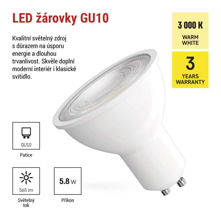 LED žárovka s paticí GU10 je moderní a energeticky úsporná alternativa ke klasickým halogenovým žárovkám. Díky vysoké světelné účinnosti poskytuje jasné a rovnoměrné světlo při minimální spotřebě energie, což snižuje náklady na provoz.