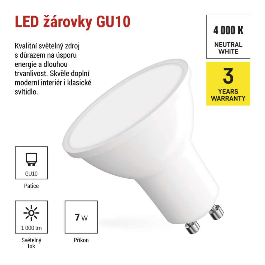 LED žárovka s paticí GU10 je moderní a energeticky úsporná alternativa ke klasickým halogenovým žárovkám. Díky vysoké světelné účinnosti poskytuje jasné a rovnoměrné světlo při minimální spotřebě energie, což snižuje náklady na provoz.