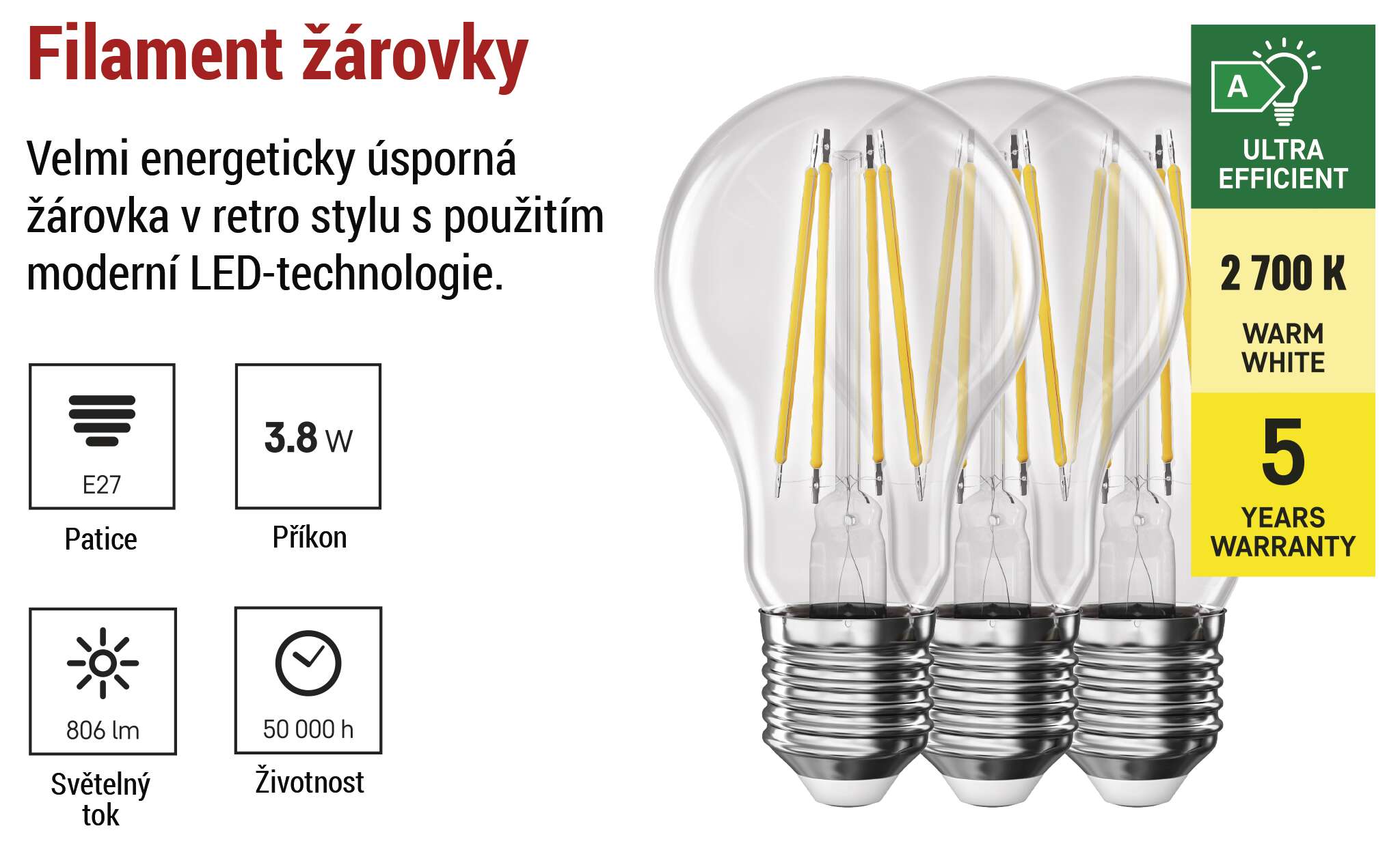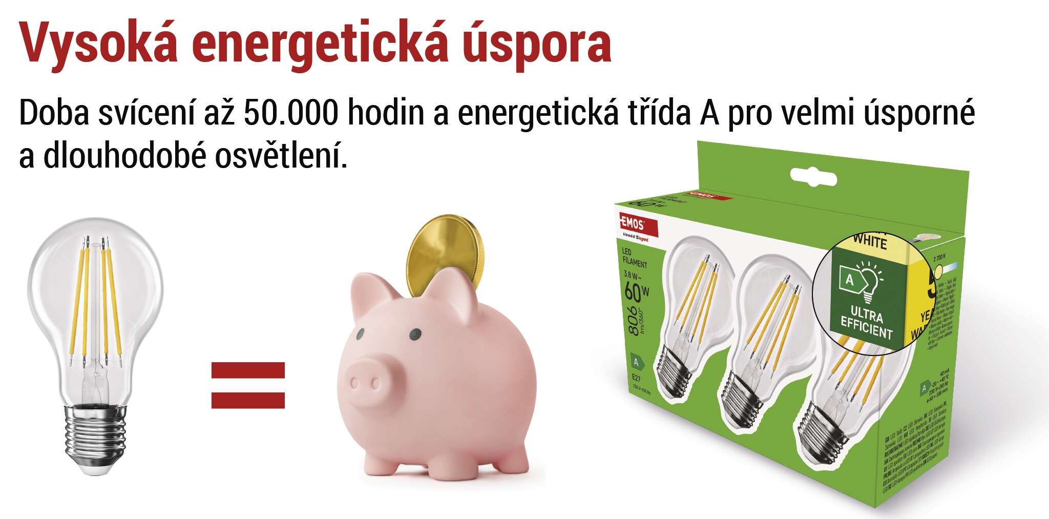 Ultra Efficient; Energetická třída A – úspora energie/peněz; Nová technologie kvalitnějších LED čipů; Záruka 5 let – jako první v sortimentu; Dlouhá životnost 50 000 h – vydrží až 2násobně oproti běžným filamentovým žárovkám; Úspora až 40 %.