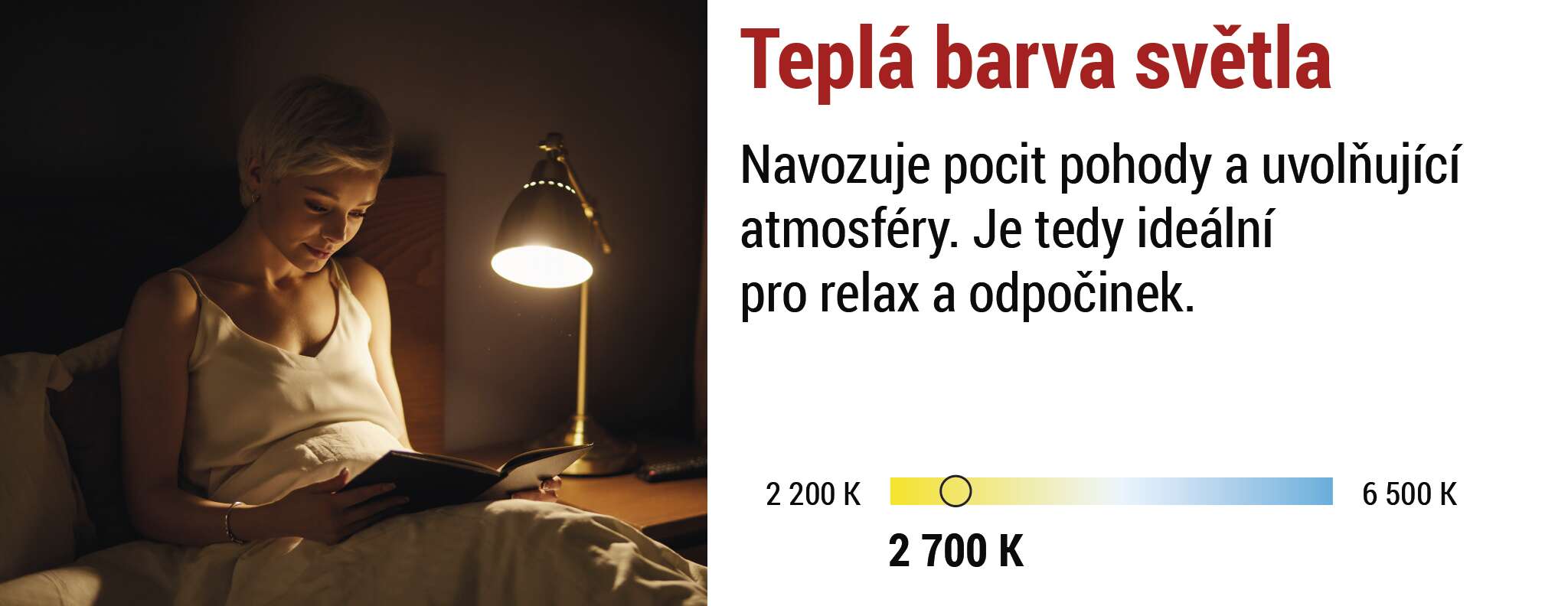 - Teplé bílé světlo je ideální pro večerní relax a odpočinek v obýváku nebo ložnici