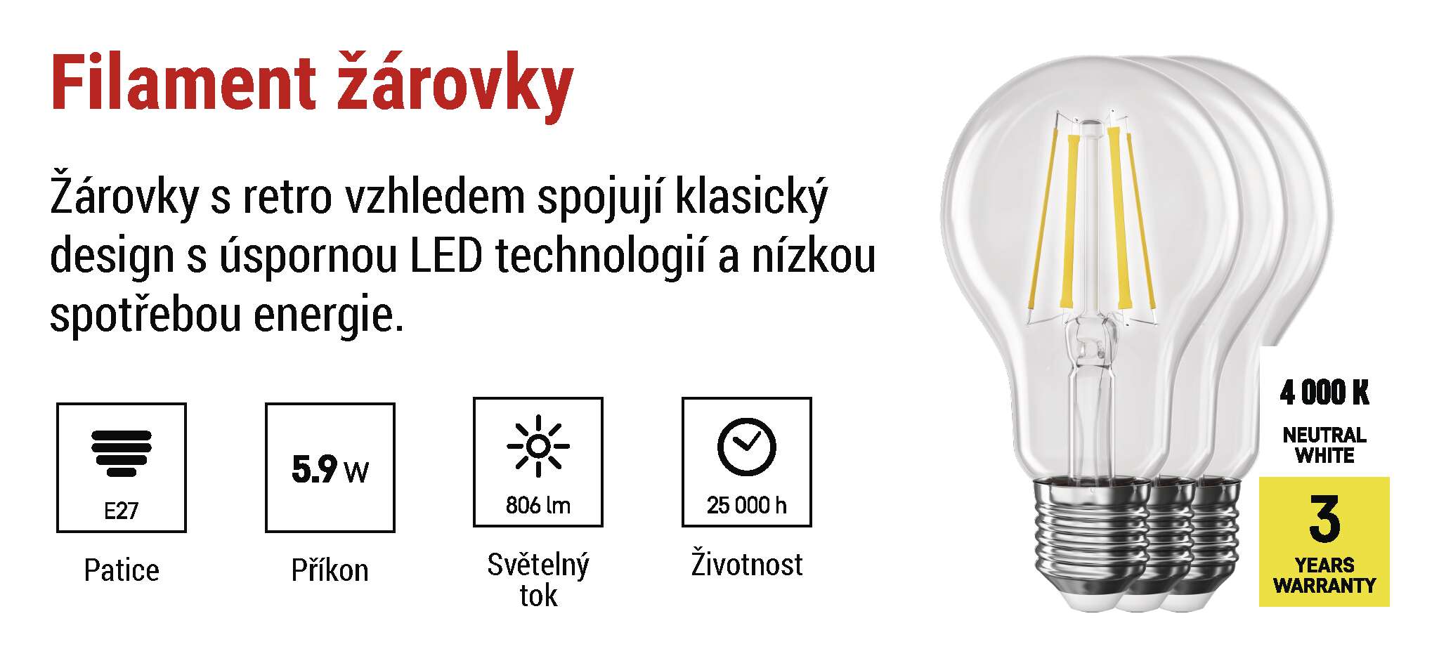 Žárovky LED FILAMENT přinášejí vysokou světelnou účinnost, dlouhou životnost a nízkou spotřebu energie. Díky klasickému tvaru a standardní patici je jejich instalace snadná a okamžité rozsvícení na plný výkon zajistí komfort při každodenním používání. Jsou vyráběny s důrazem na kvalitu a spolehlivost, aby vám dělaly radost po dlouhou dobu. Proto vám nabízíme záruku 3 roky – protože dobré světlo si zaslouží jistotu.
