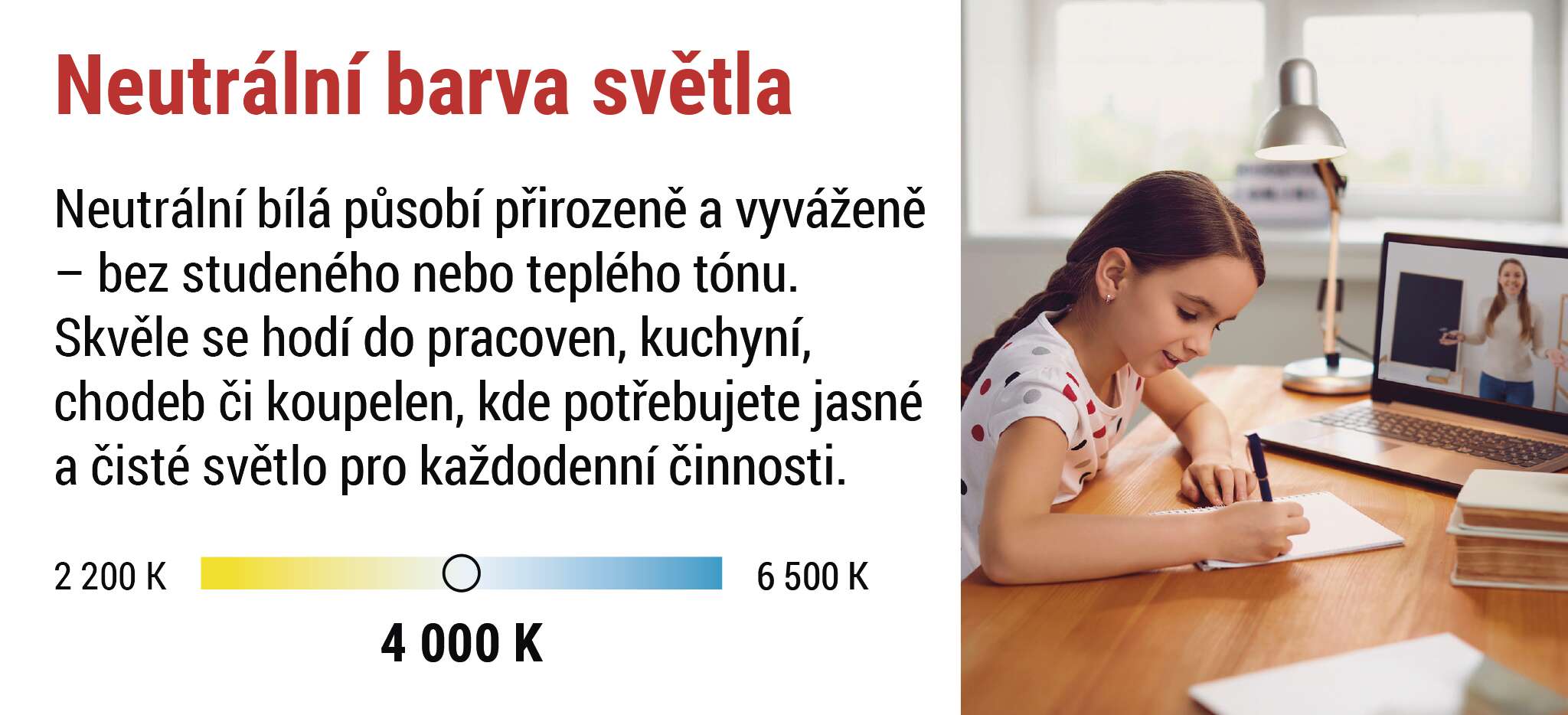 Neutrální bílé světlo působí čistě, svěže a přirozeně. Věrně zobrazuje barvy a nijak je nedeformuje, což oceníte při běžném denním provozu. Nepůsobí ani příliš teple, ani chladně – jednoduše vyvážené světlo, které se dobře snáší s jakýmkoli interiérem i denní dobou.