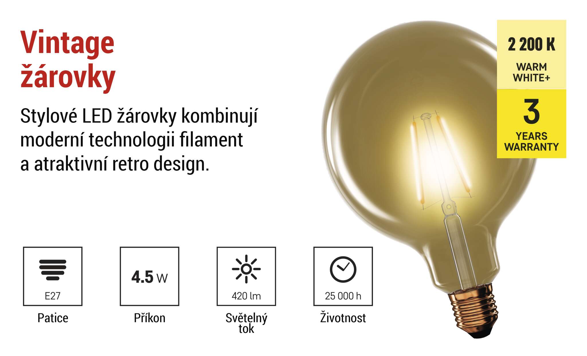 LED žárovka Vintage G125 / E27 / 4,5 W (40 W) / 420 lm / teplá bílá