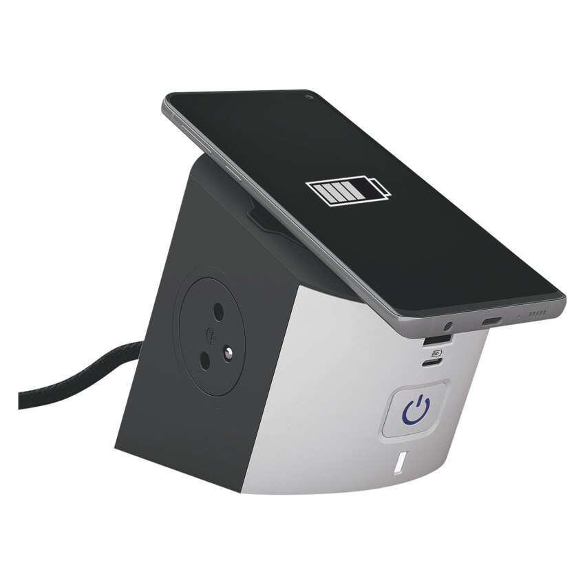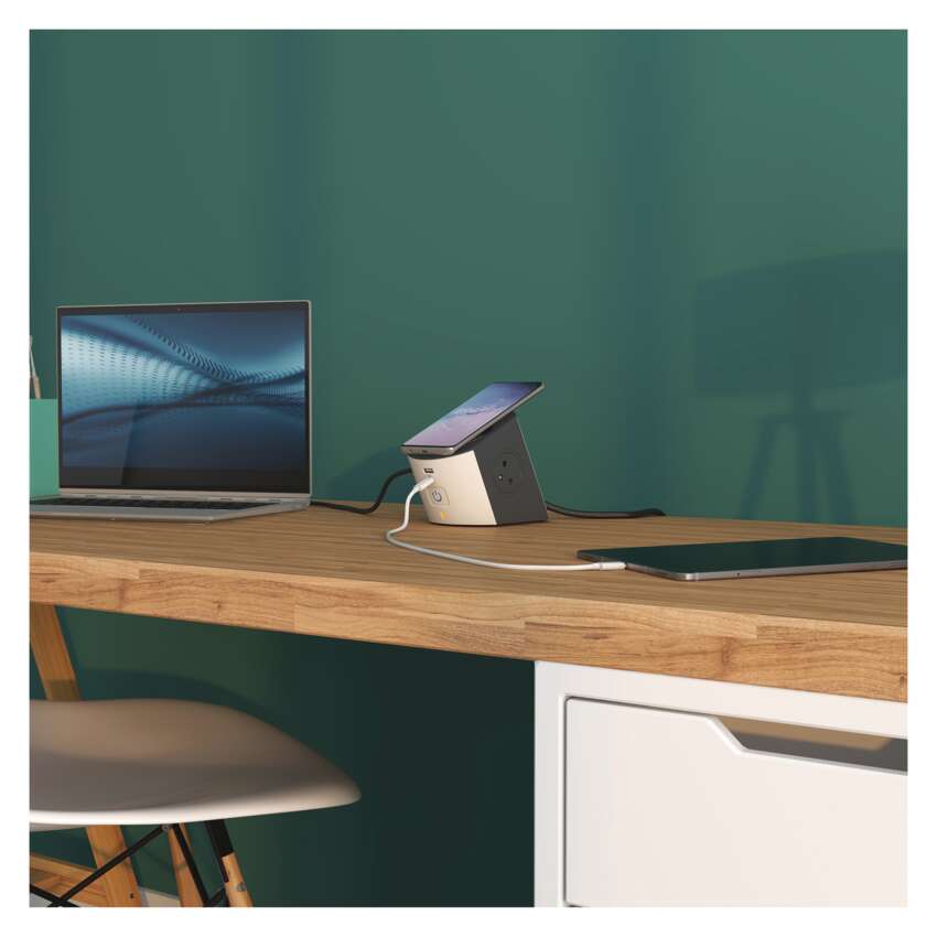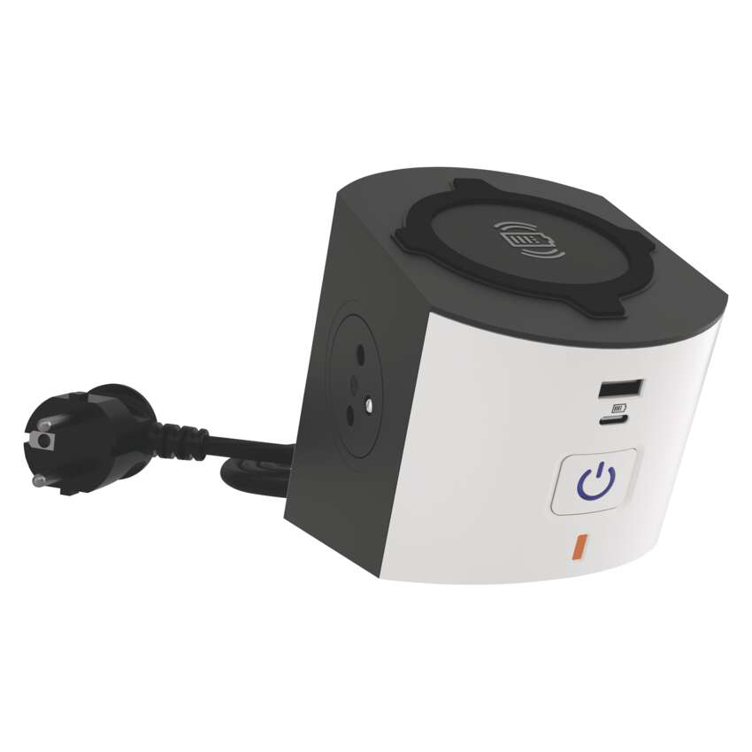 Kompaktní a praktický prodlužovací přívod s vlastní bezdrátovou nabíječkou.Nabíjejte svůj chytrý telefon efektivně bez připojování kabelu díky bezdrátové nabíjecí stanicinebo pomocí integrovaných USB nabíječek typu A a typu C.Tvar a materiál gumové protiskluzové zóny zajistí bezpečné upevnění telefonu nanabíjecí stanici.Podsvícený vypínač. LED indikace bezdrátového nabíjení.