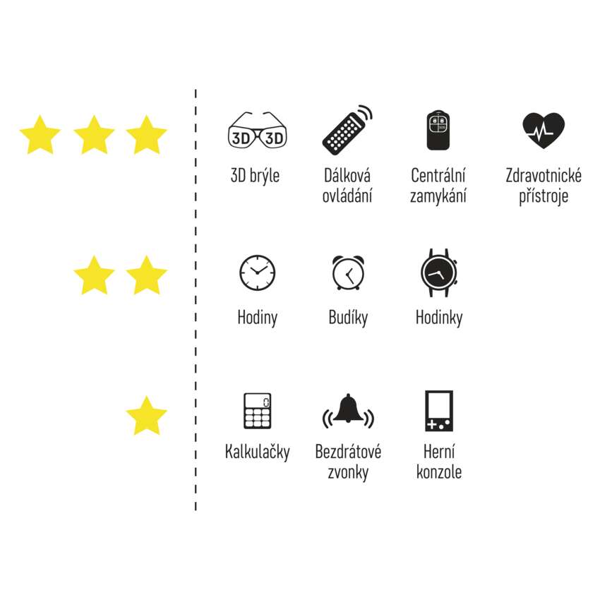 Jsou malé a šikovné. Tvoří neodmyslitelnou součást všech moderních domovů, které se nebrání novým technologiím. O bezpečnost vaší rodiny se starají v zabezpečovacích systémech, čidlech nebo detektorech kouře, život ale každý den ulehčují také v dálkových ovládáních (od auta, garážových vrat nebo elektrických rolet) a elektrických zámcích na dveřích. S jejich pomocí si ušetříte spoustu kroků navíc, zabouchnutých klíčů uvnitř bytu i odcizených věcí. Jedna sada baterií dodá energii vaší elektronice na mnoho let.