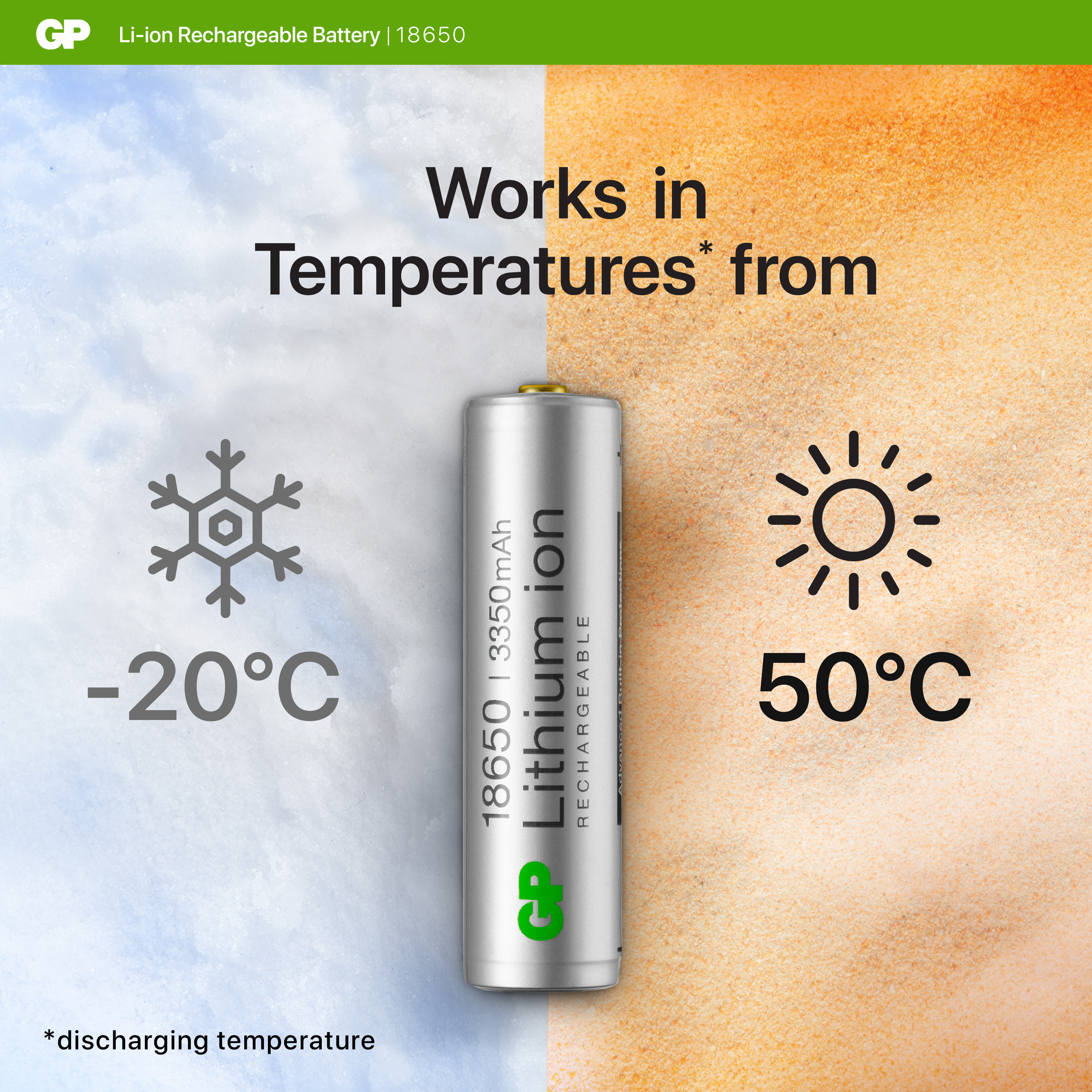 Baterie skvěle pracuje i v extrémních povětrnostních podmínkách. Je připravena na teploty od -20 do 50 stupňů Celsia. Kde ostatní baterie kapacitně nestačí, tam GP Lithium ion 18650 dál funguje.