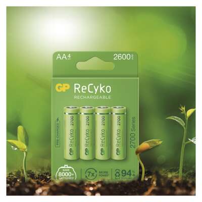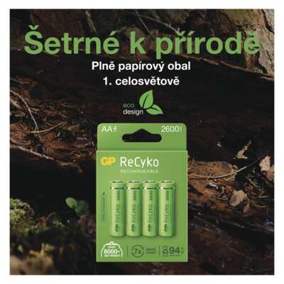 Kromě toho, že jsou baterie ReCyko plně spolehlivé, vás potěší i jejich minimální ekologická zátěž. Baterie GP ReCyko jsou totiž vyrobeny tak, aby byly šetrné k životnímu prostředí. Při výrobě jsou využívány již recyklované zdroje. Recyklovatelná je i většina materiálů, ze kterých jsou baterie vyrobeny. Společnost GP navíc myslela i na ekologické papírové balení. Baterie GP jsou tak skvělým výrobkem pro ty, kterým na přírodě záleží.