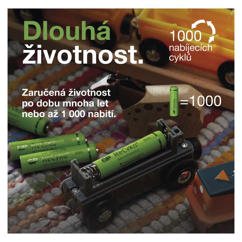 Používání nabíjecích baterií GP ReCyko je pohodlné, ekologické a finančně výhodné. Baterie vám totiž vydrží několik let, aniž by slábl jejich výkon. I po 1 000 nabitích a vybitích si udrží většinu své kapacity. V porovnání s ekvivalentní dobou používání jednorázových baterií tak ušetříte nemalé finanční prostředky.