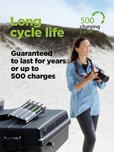Používání nabíjecích baterií GP ReCyko Pro Photo Flash je pohodlné, ekologické a finančně výhodné. Baterie vám totiž vydrží několik let, aniž by slábl jejich výkon. I po 500 nabitích a vybitích si udrží většinu své kapacity. V porovnání s ekvivalentní dobou používání jednorázových baterií tak ušetříte nemalé finanční prostředky.