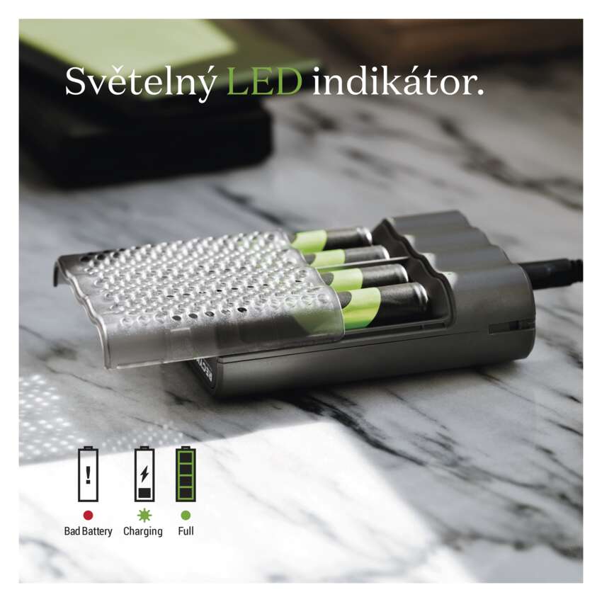 Seznamte se s elegantní nabíječkou s inteligentními bezpečnostními a technickými funkcemi, která najednou nabije až 4 baterie AA nebo AAA.
