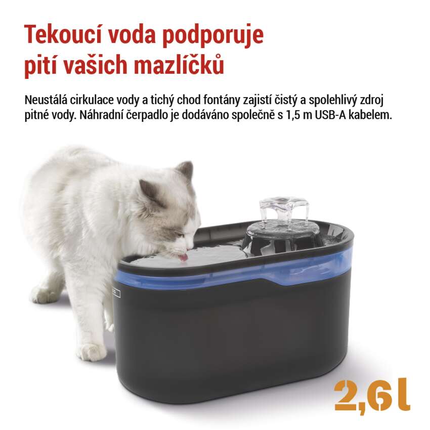 Čerpadlo je vhodné pro Vodní fontánu PET-201 (H6101). Balení obsahuje náhradní čerpadlo včetně 1,5 m USB-A kabelu a filtru do čerpadla. Chod čerpadla je velmi tichý a zajišťuje pravidelnou cirkulaci vody.