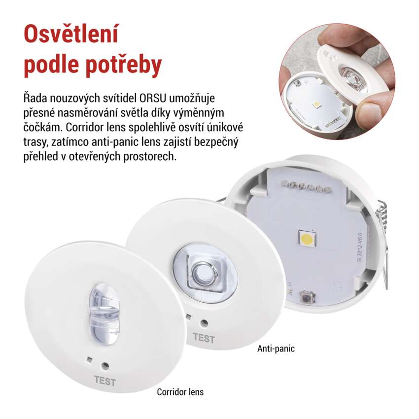 Náhradní čočky umožňují přizpůsobit osvětlení konkrétním potřebám prostoru. Corridor lens se používá v úzkých chodbách a koridorech, například v kancelářích, školách nebo hotelech, kde směruje světlo podél cesty a zajišťuje rovnoměrné a jasné vyznačení únikové trasy. Antipanic lens je určen pro otevřené prostory, například haly, foyer nebo veřejné místnosti, a díky širokému rozptylu světla umožňuje bezpečnou orientaci a pohyb, i když se v prostoru nachází více osob současně. Obě čočky tak zajišťují spolehlivé a bezpečné osvětlení přesně podle charakteru prostoru a jeho potřeb.