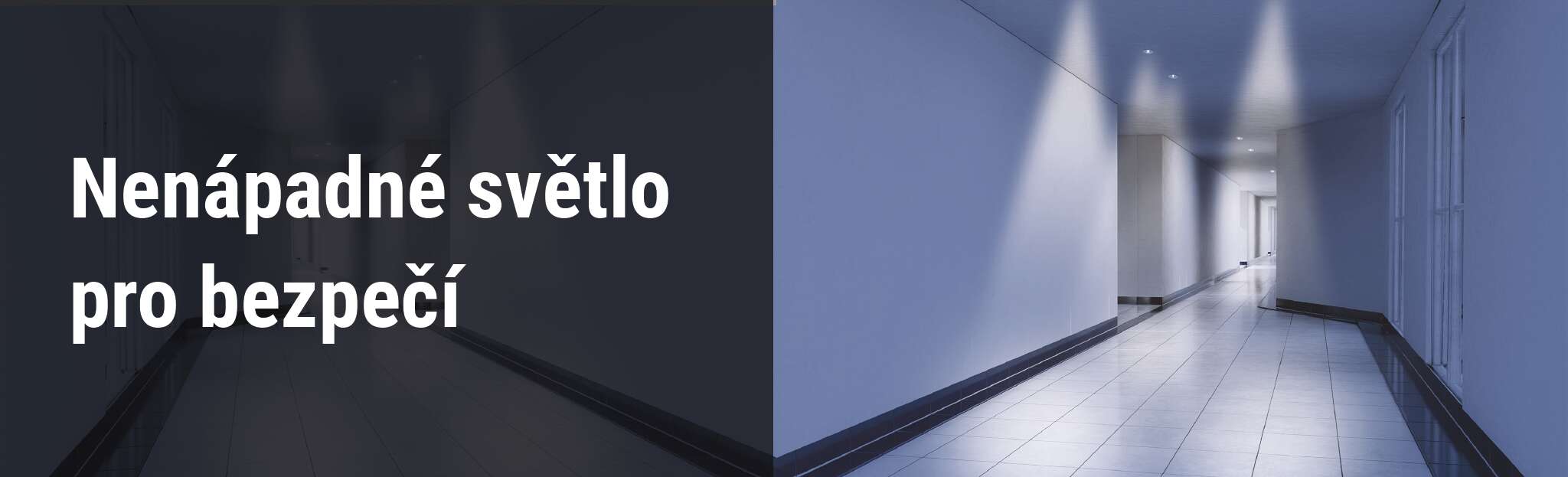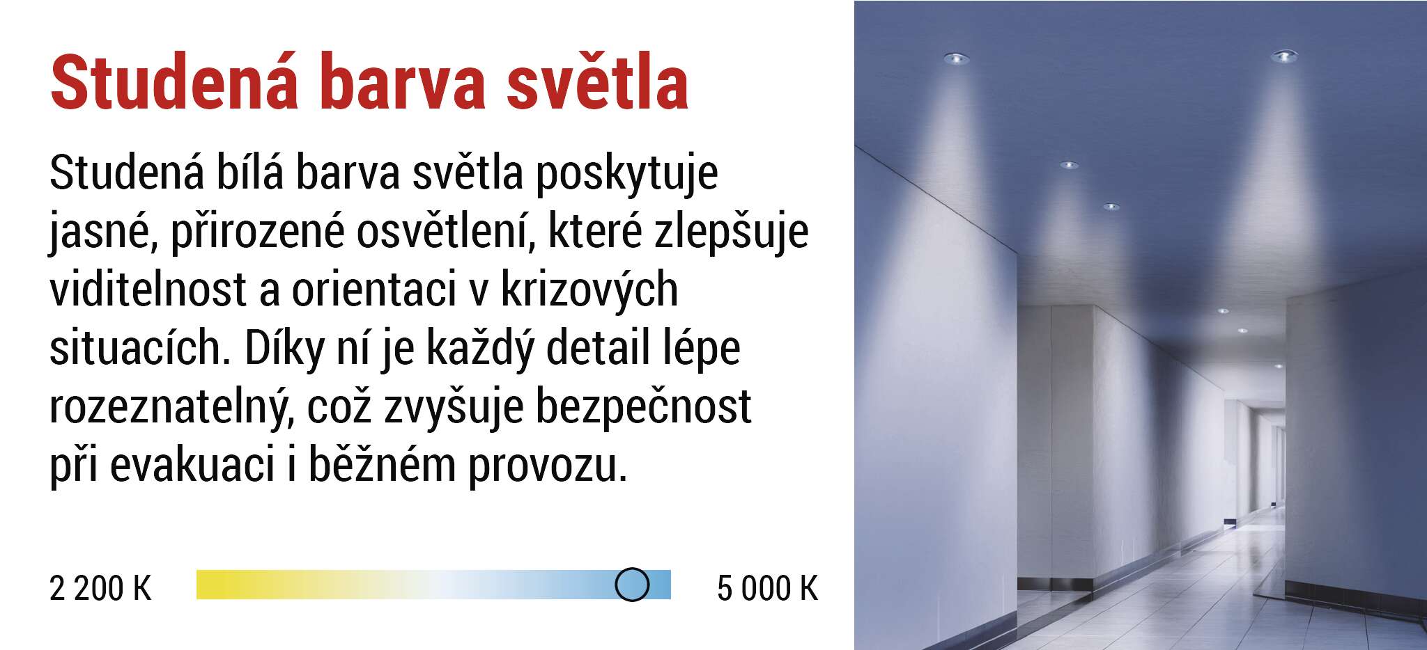 Díky studené bílé barvě světla nouzové osvětlení jasně vyznačuje únikové cesty a umožňuje bezpečný pohyb a orientaci i při výpadku proudu.