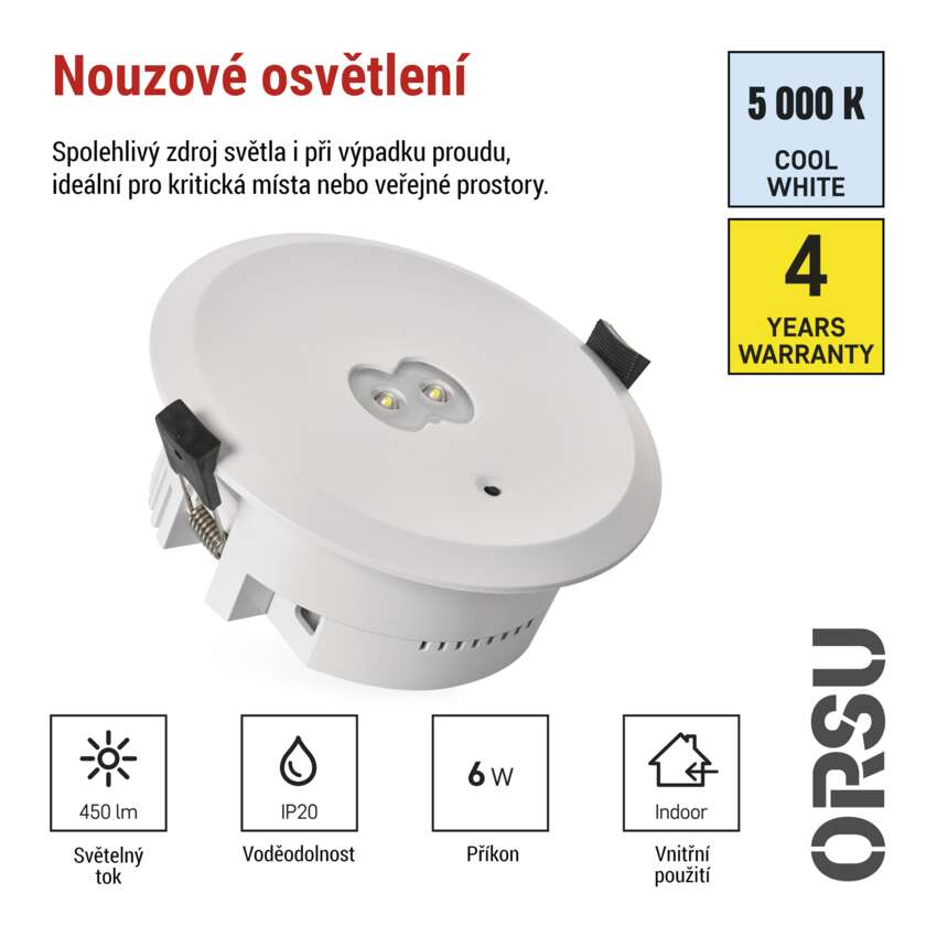 Bodové nouzové osvětlení ORSU s krytím IP20 poskytuje jasné a spolehlivé světlo při výpadku proudu. Díky snadné montáži a modernímu designu zajišťuje bezpečnou orientaci v kancelářích, obchodních prostorách i domácnostech, aby každá cesta byla bezpečná a dobře viditelná..