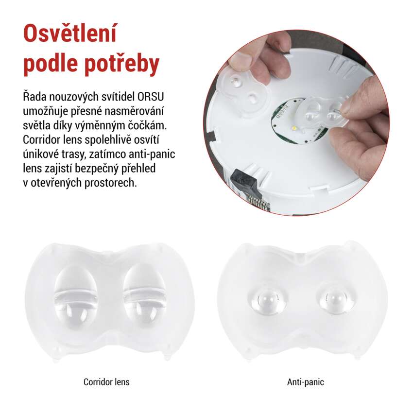 Náhradní čočky umožňují přizpůsobit osvětlení konkrétním potřebám prostoru. Corridor lens se používá v úzkých chodbách a koridorech, například v kancelářích, školách nebo hotelech, kde směruje světlo podél cesty a zajišťuje rovnoměrné a jasné vyznačení únikové trasy. Antipanic lens je určen pro otevřené prostory, například haly, foyer nebo veřejné místnosti, a díky širokému rozptylu světla umožňuje bezpečnou orientaci a pohyb, i když se v prostoru nachází více osob současně. Obě čočky tak zajišťují spolehlivé a bezpečné osvětlení přesně podle charakteru prostoru a jeho potřeb.