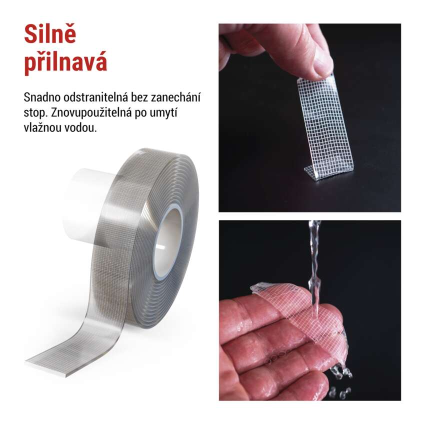 Speciální mřížková struktura zajišťuje spolehlivé uchycení na hladkých površích, jako jsou sklo, dlaždice, kov, plast nebo lakované plochy. Pásku lze snadno odstranit bez zbytků lepidla a znovu použít – stačí ji opláchnout vodou a nechat uschnout.