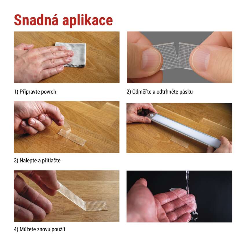 Použití oboustranné pásky NANO je rychlé a intuitivní. Stačí očistit povrch, odměřit a odtrhnout požadovaný kus pásky, nalepit a pevně přitlačit. V případě potřeby lze pásku snadno odstranit, opláchnout vodou a znovu použít, aniž by ztratila svou přilnavost.
