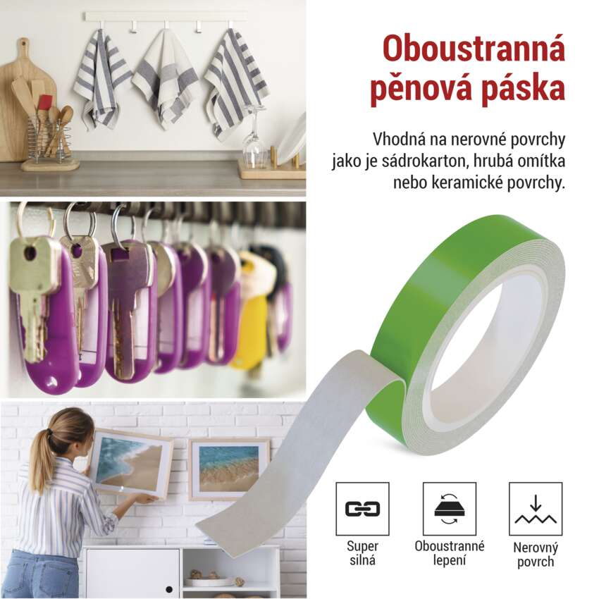 Kvalitní oboustrannou pěnovou pásku lze nalepit na většinu povrchů, které se nedrolí a neloupou, jako jsou hrubé omítky, sádrokartony, keramické obklady, sklo, dřevo, kov atd. Páska je opatřena akrylovým lepidlem po obou stranách, což z ní činí výborného pomocníka pro lepení v interiéru i exteriéru. Díky tloušťce 1 mm se hodí také jako vhodný materiál na vyrovnání nerovností, polstrování či pohlcení vibrací a tlumení zvuku. Je vhodná pro zavěšení lehkých věcí, ale poradí si i s těžšími předměty, jako jsou například zrcadla nebo informační či reklamní cedule, bez obavy z pádu.