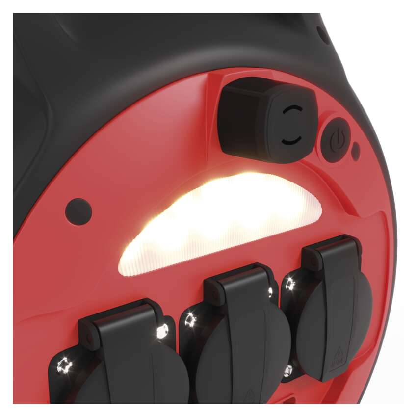 Naviják má také zabudovaný menší LED reflektor. Můžete si tak přisvítit pro snažší zapojení spotřebičů do bubnu při práci v šeru.