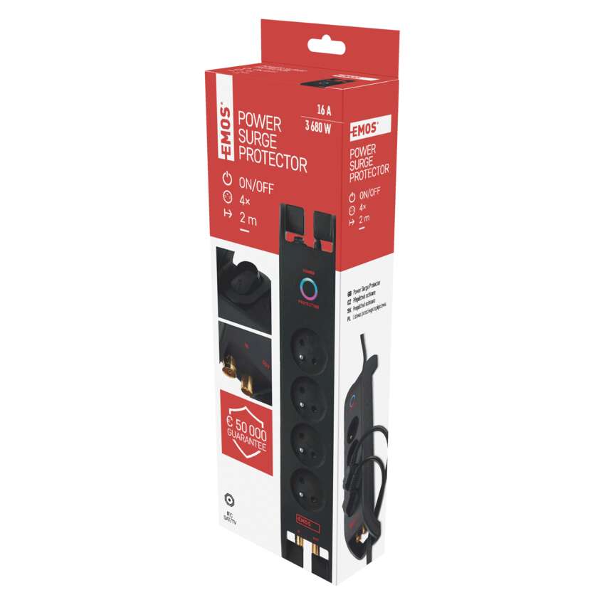 Přepěťová ochrana 1800J – 4 zásuvky, 2m, černá