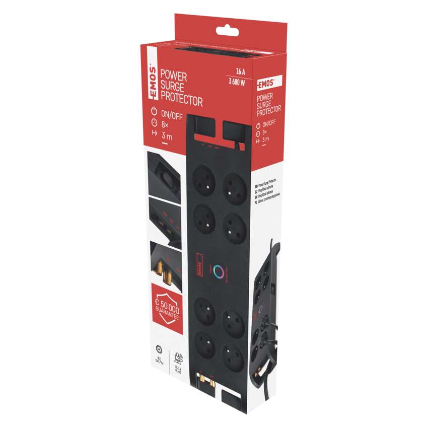 Přepěťová ochrana 1800J – 8 zásuvek, 3m, černá