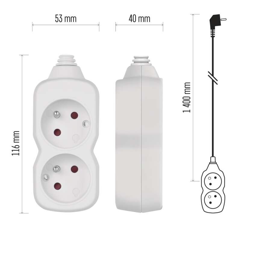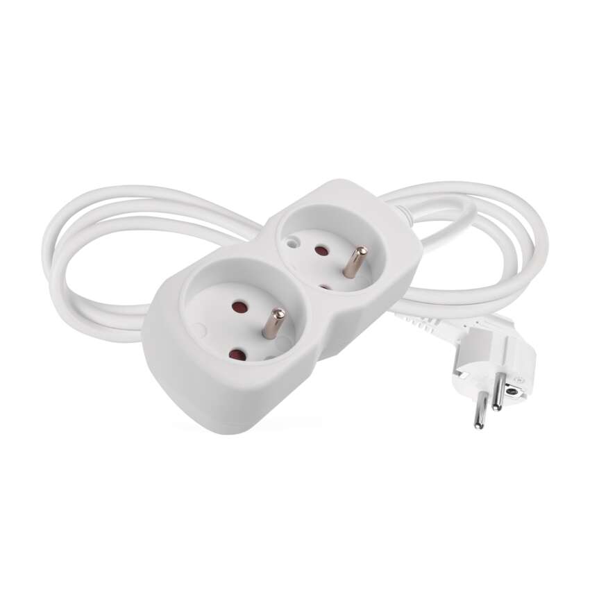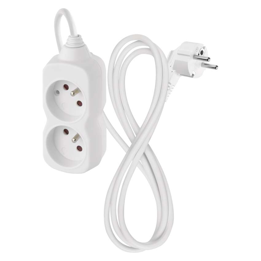 Bílý prodlužovací přívod, 2 zásuvky s dětskými clonkami a délkou 1,4 m. Průřezem vodiče 1 mm2. Vhodný pro maximální zátěž 16 A max.Při montáži na stěnu je nutné použít vrut se zápustnou hlavou PZ max. průměr 2,5–3 mm, délka 30–40 mm. V případě použití jiného průměru hrozí poškození plastové části otvoru. Pokud dojde k poškození plastové části otvoru, prodlužovací přívod nepoužívejte.