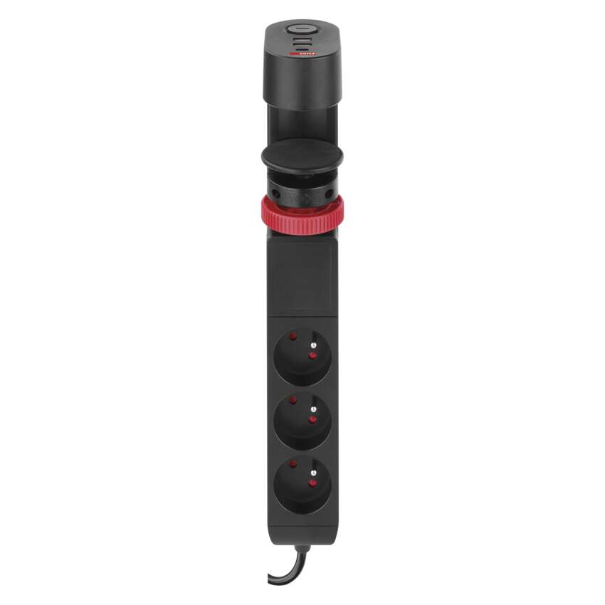 Prodlužovací kabel 1,5 m/3 zásuvky/vypínač/uchycení na stůl/USB/černý/PVC/1,5 mm2