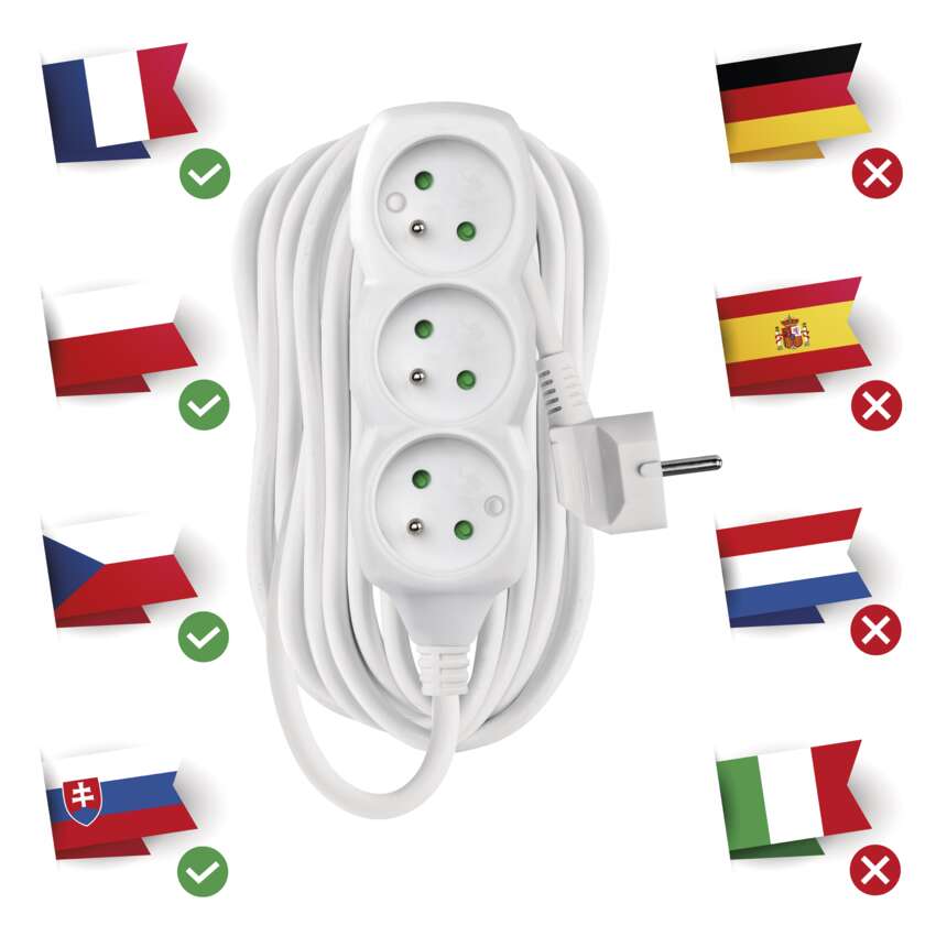 Bílý prodlužovací přívod, 3 zásuvka s délkou 10 m a průřezem vodiče 1 mm2. Vhodný pro maximální zátěž 10 A max.Prodlužovací přívod 10 m na 230 V~ slouží k prodloužení elektrické energie tam, kam pevná zásuvka nedosáhne.Při montáži na stěnu je nutné použít vrut se zápustnou hlavou PZ max. průměr 2,5–3 mm, délka 30–40 mm. V případě použití jiného průměru hrozí poškození plastové části otvoru. Pokud dojde k poškození plastové části otvoru, prodlužovací přívod nepoužívejte.