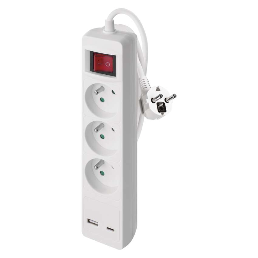 Prodlužovací přívod s vypínačem. 250V~/16A max. 3 zásuvky s dětskými clonkami. USB A+C 3,4 A, 17 W max. Délka přívodního kabelu 2 m. Vodič H05VV-F3G 1,5mm2.